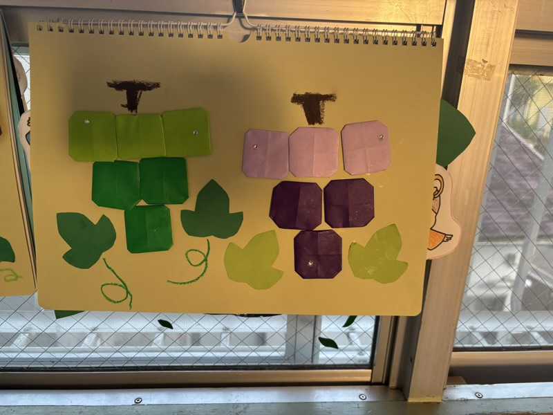 これは5歳児の作品です。折り紙で作ったぶどうの実が立体的で、とても美味しそうですね。緑と紫の二色のぶどうがあり、それぞれの色合いがよく出ています。ワンポイントで貼られているキラキラのシールが、ぶどうの瑞々しさを表現していて、とても素敵なアイデアです。葉っぱやツルの部分も工夫されていて、秋らしい作品に仕上がりました。子どもたちの豊かな感性が光っています。