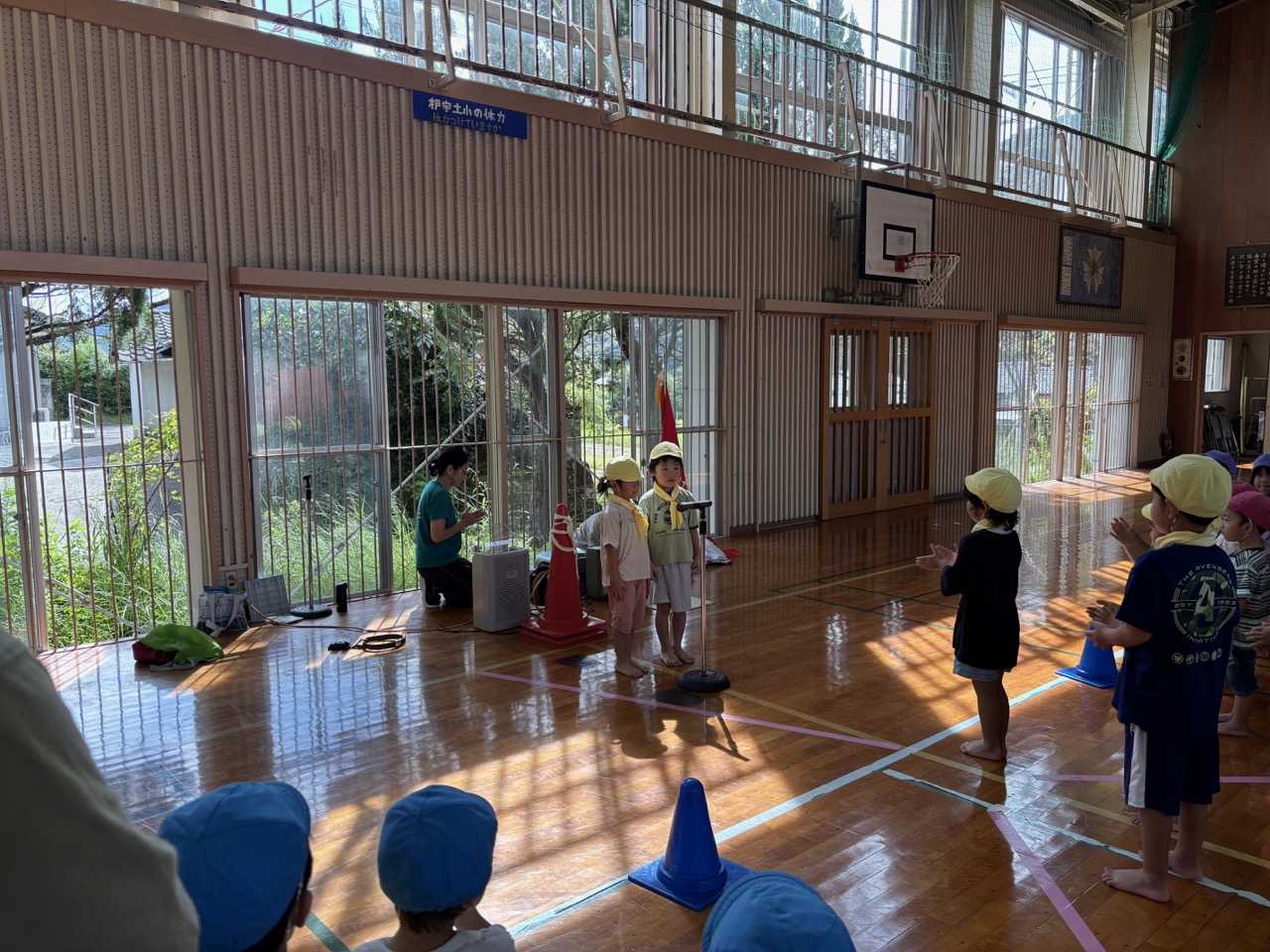 今日は、市民センターの体育館をお借りして、大切な予行練習を行いました!広い会場で緊張もあったかと思いますが、子どもたちは本番さながらの真剣さで頑張っていましたね。特に、写真のように、皆で集まって先生のお話を聞く時の姿勢の良さは素晴らしかったです。集合や移動の練習では、帽子の色ごと(黄色・ピンク・青)にテキパキと動いたり、お友だちと協力したりと、みんなの成長を感じました。大きな行事に向けて、気持ちが一つになっているのが伝わってきます。明日も引き続き練習がありますが、今日のように元気いっぱい、そして安全に楽しく取り組みましょう!みんなで力を合わせて、本番を成功させましょう!!