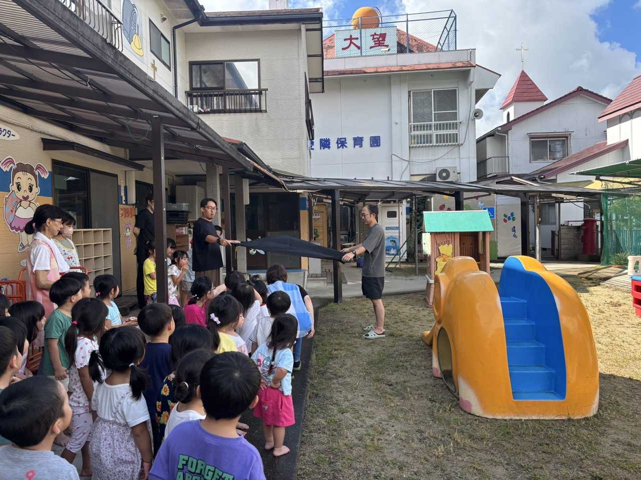 本日、保育園で避難訓練を実施しました。子どもたちは、真剣な表情で保育士の話を聞き、落ち着いて行動することができました。訓練では、水消火器を使った初期消火体験を行い、使い方を学びました。また、モバイルバッテリーの発火事故について、子どもたちにも分かりやすい言葉で危険性と対処法を説明しました。日頃からの意識と訓練の大切さを改めて感じた一日となりました。