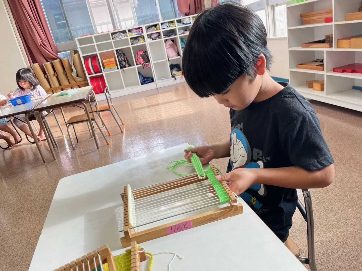 可愛らしい小さな織り機を使って、モンテッソーリの機織り活動に取り組む園児たちの真剣な眼差しが印象的です。縦糸と横糸を交互に通していく作業は、集中力と手先の器用さを養います。一つ一つ丁寧に織り進める姿には、達成感と喜びが溢れています。この活動を通して、子どもたちは論理的な思考力や、ものづくりの楽しさを体験しています。自分で作り上げた作品は、きっと大切な宝物になることでしょう。