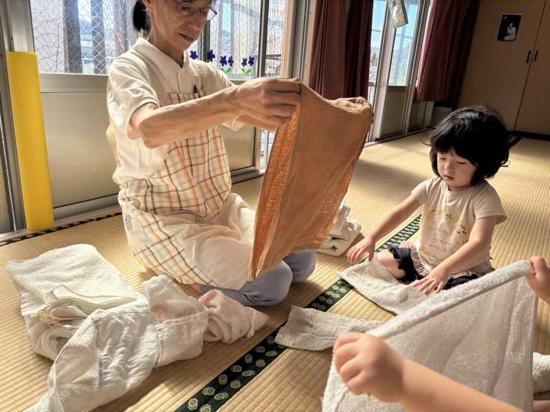 洗濯物畳みをしていると、1歳児さんがお手伝いをしてくれました。真剣な表情で、たたみ方を教えると、一生懸命、少しずつ丁寧に畳んでくれます。その姿はとても可愛らしく、大助かりです。日々の生活の中で、子どもたちの成長と自発的な行動に触れることができ、私たちも嬉しい気持ちになりました。これからも様々な活動を通して、できることを増やしていってほしいと願っています。