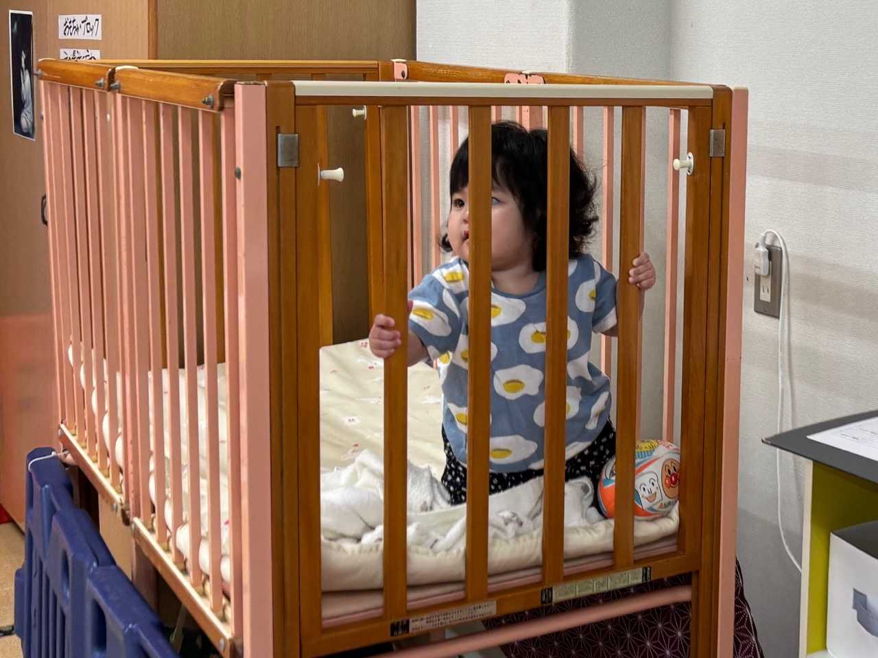 お友達はベッドの柵につかまって、一生懸命つかまり立ちの練習をしています。小さな足でしっかり踏ん張っているものの、まだ完全に立ち上がるまでには至らず、腰が引けた半立ち上がりの状態です。周りをきょろきょろと見回しながら、何か面白いものはないか探しているようにも見えます。そのつぶらな瞳は好奇心でいっぱいです。あと一歩で立ち上がれそうです