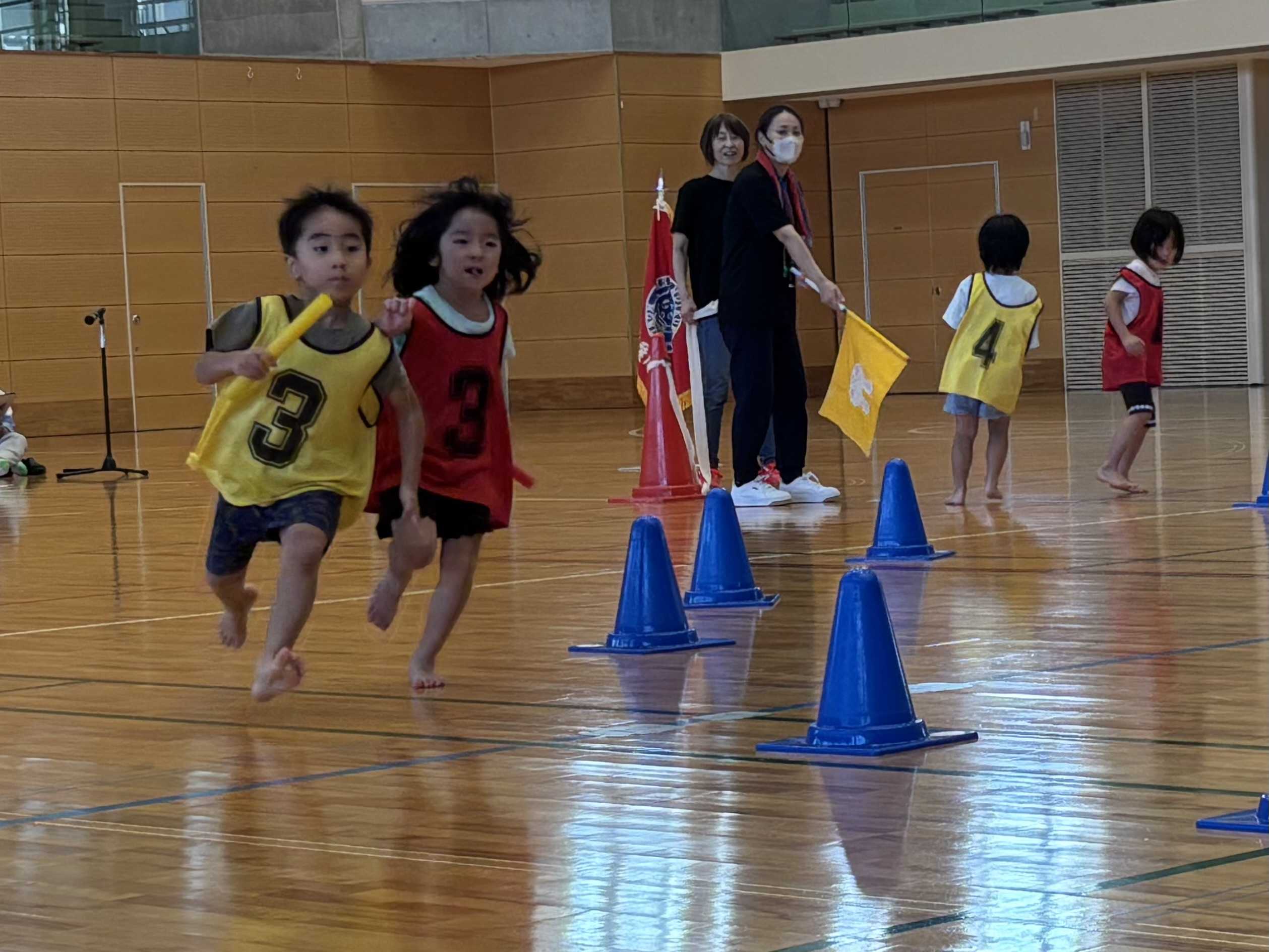 以前より体の動かし方がしっかりとして、ゴールに向かって一生懸命走る姿に大きな成長を感じました。遊戯では、友達と一緒にリズムに合わせてダイナミックに踊る様子も見られ、練習の成果を発揮してくれました。また、親子競技の玉入れでは、保育者が持つカゴを狙って保護者の方と一緒に玉を投げ入れ、普段とは違う競技に親子ともに満面の笑顔で参加されていました。目標に向かって頑張る姿や、友達、そして保護者の方との関わりの中で、子どもたちが多くの達成感や喜びを感じた運動会になったことと思います。たくさんのご声援ありがとうございました。
