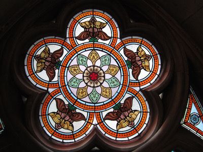 階段にはレッド・カーペーットが敷かれ、重い荷物持って息切れしながら登る人々に美しいステンドグラスが優しい光を投げかけています。