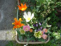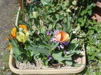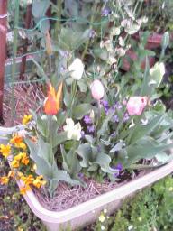 ここのところ、チューリップがどんどん開いていましたが、ピンクはこう見ると八重だったんですね。 里子チューリップは、シロ系ばっかでした。自生物も元気に頑張っているようですけど、オレンジ色は誰?これがプランターの中だと本当はいいのですけど。