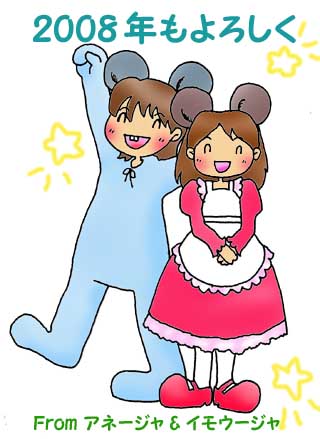 今年も一週間を切りましたねぇ皆さんお正月を迎える準備は着々と整ってきましたか?私は年賀状を投函した位で、大掃除やその他の準備は全く終わっていないのですが、このままお正月に突入する事になりそうです実は明日から旅行なんですそんな訳で、ちょっと早いのですが、お正月のご挨拶イラストを描きました。イラストを描いた後に、イモウージャに会ったのですが、イモウージャったら私に会う一日前に美容院に行って髪形を変えていたんですよ~新しい髪形はとっても似合っていたのでニューヘアスタイルのイラストも今度描きたいなぁと思っています旅行先からブログの更新に挑戦するつもりではおりますが、失敗したらごめんなさいそれでは皆様2007年度大変お世話になりました2008年度もよろしくお願いいたしますねFROM アネージャ