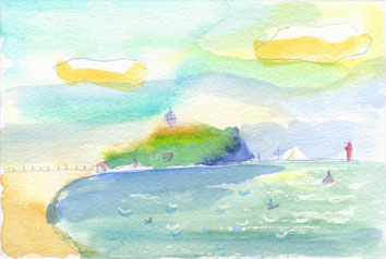 最近アネージャにブログ更新を任せっきりだったので、久々にイモウージャが更新します。江ノ島を思い出しながら家でちょちょっと描きました。島の形や灯台の位置など間違えちゃったので、またこんどスケッチに行きたいと思います。寒くてくじけちゃうかもしれませんねさてさて、この絵とは何も関係ないのですが・・・先日ご紹介した橋本シャーンさんのスケッチ展に行ってきました。代官山の駅に着くと、一緒に行った友人が、「あれって芸能人が乗ってるんじゃない!??」と言ってミニバスみたいなのを指さしました。黒い窓で車内が見えないその車は、駅の真ん前にあるネイルサロンの前に止まっていました。私も結構ミーハーちゃんですが、友人は私の上をいっています。「誰がいるのか絶対見たいんだけど」と言って5分程様子をうかがっていたのですが、スタッフらしき人やマネージャーっぽい男の人が出入りしているのが見えただけでした。時間もなかったので早々に切り上げ、スケッチ展の会場「ヒルサイドテラス」へ向かいました到着して一通り作品を拝見しましたが、後ほどシャーンさんがいらっしゃるということだったので、私はいったん抜け出して、別館で行われていた昭和シェル石油主催のシェル美術賞展をのぞいて来ました。この賞は40歳以下の人の公募展で、思ったより沢山展示してあって面白かったです。そして再びシャーン展に戻ると、橋本シャーンさんが到着されていました。シャーンさんの第一印象は、ちょいワル?いや・・・すごワルオヤジでした60歳を超えていらっしゃるはずですが、ニット帽にサングラス、だぼっとしたセーターに使い古したジーンズ、スニーカーという出で立ちで、缶ビールを飲みながらメチャクチャ軽快なトークに花を咲かせていました。とても気さくな方で、話の端々にまんべんなく笑いを散りばめてお話されるので、会場に居た人は皆さんずーっと笑っていました。肝心の絵の方は、とても鮮やかな色の水彩でパリのセーヌ川やオペラ座、モンマルトルなどを描かれていました。混色は殆どなさらないらしく、とにかく明るい色彩です。色数はけっこう使っているようですが、まとまりがあってとてもステキでした。真似したくてもあれだけ色を使うのは私には難しいです。今回2つの展示を見て思ったことは、橋本シャーン展ではどの絵も欲しいと思える気持ちよい作品ばかりでした。そして、シェル美術賞展はインパクトはあるけど欲しいと思える作品はほとんど有りませんでした。公募展に出品するには審査員の目に止まらなければならないのでインパクトは大変重要な要素だと思いますが、「インパクト」と「欲しいと思わせる魅力」を同居させるのはとても難しいことなのかなと感じましたfrom イモウージャ