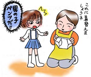 今回は幼稚園の時のお話をしたいと思います。私は家が大好きな子供だったので、この保育に行くのが嫌で嫌で、幼稚園まで送ってくれる父に泣いてすがってなかなか離れない困った子供でした。この3年保育の記憶はあまりないのですが、数少ない記憶のなかに「おもらし」をした記憶がありますおもらしをして、先生にそれを訴えた所、先生は優しく対応してくれました。園に予備で置いてある替えのパンツをゴソゴソ探してくれ、そして笑顔で出してきたのがブリーフだったのですおもらしをして恥ずかしいとか、そんな記憶は全く無いのです・・・人生で初めて男の子のパンツ「ブリーフ」をはかないといけなかった。それがとっても嫌だったと言う記憶だけなのです・・・世の中には女の子なのに「男の子パンツ」を、男の子なのに「女の子パンツ」をやむなく着用したという人が結構いるものですよね。みなさんはどうですか?FROM アネージャ