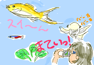 日曜日に久々にペットショップに行きました。第一目的は、そろそろ産卵シーズンを迎えるメダカちゃんのための水草ですがついでに、色々あってちょっと人口密度の低くなったメイン水槽用に新しい入居者を連れて帰ることにしました。まずはちっちゃいうちは可愛い、定番ネオンテトラ。このこ達は10匹380円で入居決定。そして我が家の人気者、セルフィンモーリー系。今、うちにはブラックライヤーモーリー(黒森さん)1匹と、シルバーライヤーモーリー(銀森さん)6匹くらい?そして黒と白の子らしき灰色のチビが2匹います。彼らは食欲がありすぎるし、勝手に増えてるのでもう十分だったのですが・・・お店の水槽をのぞくと、山吹色の新顔が居るではありませんか!お名前は、ゴールデン何とか。忘れちゃいましたゴールデンライヤーモーリー、かなぁ?山吹色ではなく、金と表現すべきだったんですね。とにかく、なんだかとっても綺麗で可愛いのです。黒森さん、銀森さんは一匹180円ですが、金森さんは300円ちょいと高級感がただよっていましたが、2匹、一緒に帰っていただくことになりました。そして今夜、記念&ブログ用に写真撮影・・・のハズだったんですが、すごい元気に泳ぎまくって逃げに逃げられピンボケ写真ばかりになってしまいました。私の撮影技術は、のんびり屋のコリドラスちゃんでさえまともに撮影できない位なので、所詮はムリな挑戦だったのです。なので今日は、このピンボケ写真を元にイラストにしてみました。絵にするのも愛着がわいて良いものだ、と自分に言い聞かせ、写真は諦めることにしました。from イモウージャ ↑ ↑ ↑★人気ブログランキングに参加中★ ポチッとお願いします♪