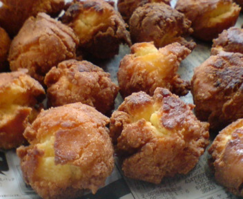 アネージャに数年前に沖縄土産でもらったサーターアンダギーミックス、面倒くさくてほったらかしにしていましたしかし、先日パン屋さんで買ってきたサーターアンダギーがとても美味しくてすぐに食べ尽くしてしまい・・・「今すぐ食べたいっ」この衝動を抑えきれずに、とうとうお土産の封を開けることにしました。賞味期限に厳しい昨今ですが、私はわりとアバウトです。2004年10月かぁ・・・3年半の歳月がたっていました。まぁ粉だし、美味しくないかもしれないけど油で揚げるしお腹は大丈夫・・・きっとそして食欲のおもむくままに作りました。作り方はとても簡単。1.卵3コを軽く泡立て、粉(サーターアンダギーミックス)を加えてヘラでサックリ混ぜる。2.サラダ油または溶かしバターを大さじ2杯加えて更にちょっと混ぜる。 ・・・私は両方を大さじ1ずつ入れてみました。3.ピンポン球サイズに丸め、油で約8分揚げる。 ・・・大さじスプーンがちょうど良いサイズだったので、これに詰めて丸めました。 ・・・お鍋が小さかったせいで高温になったのか、5分程で揚がってしまいました。 4コずつ揚げました。山盛り出来上がりました。ちょっと揚げすぎて日焼けしたキツネのようになりましたが、外はサクサク歯ごたえがあり、中は柔らかくてとても美味しく出来ました。賞味期限内の粉だったらもっと美味しくできるのかもしれません。この粉はいつも行くスーパーにも売っているし、アネージャに貰ったのがもう一袋あるので、また作りたいです。食べ過ぎ注意ですが私が使ったのはこの粉です。サーターアンダギーミックスfrom イモウージャ ↑ ↑ ↑★人気ブログランキングに参加中★ クリックで投票をお願いします♪