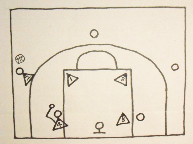 こんにちはenoです。 ローポストにボールが入る前、(4)はサイド・ローでディフェンスをします。 ハイポスト側には、カバーがいますので、【図4】のように、ウィークサイド側から腕を伸ばしておくのが良いでしょう。 【 図4:ボールがローポストに入る前】 ボールが入った場合、(4)は"オフェンスの背中に手を伸ばさず肘をつける"姿で密着します。簡単に前を向かせないことを心掛けてください。 そして、ボールが入った瞬間に、ウィングにいた(2)がダブルチームに行きます。【 図5】 【 図5:ローポストのダブルチーム 】 (1) (3) はパスカットを狙い、(5)は飛び込んでくるオフェンスをブロック。ゴールキーパーとして制限区域内を守ります。 ボールがウィングに戻れば、【図4】の形に戻るわけです。 プラグという決まり事があれば、このとき選手が正確にポジションに戻ることが出来ます。 ■ 榎本のまぐまぐメルマガ(当ブログと内容が違います)『 Never give up! ~バスケットボールと共に歩んだ道~ 』 はこちらから http://archive.mag2.com/0001186611/index.html ■ このブログに関する、ご意見、ご質問、ご要望はこちらまで enosann★gmail.com( 迷惑メール防止のため、★を@に置き換えてください。■ ブログランキング参加中。押していただけると励みになります。