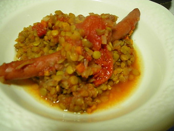 5/6の夕食レンズ豆のトマト煮(ソーセージ付)新潟で買った佃煮(アサリ・あみ・昆布)この日はほかにサラダ、新潟で買った塩干鮭を少し。