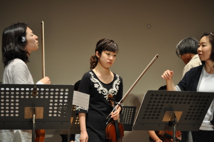 2014/04/26ensembleNOVAバロックの本番当日。10時すぎからリハーサルに立ち会う。バランス聞いたり、あとはもうひたすらソリスト妃奈子にダメ出ししてました(-_-;)。お昼は楽屋で軽食。おれは例によって楽屋ではボウイング作業に没頭14時から本番今回は「1,2,3,4!」とゆーコンセプト。プログラムは以下のように、独奏ヴァイオリンが1人から2人、3人、4人とひとりずつ増えていくという仕掛けになってます。バッハ/ヴァイオリン協奏曲イ短調バッハ/2つのヴァイオリンのための協奏曲ニ短調バッハ/3つのヴァイオリンのための協奏曲ニ長調ヴィヴァルディ/4つのヴァイオリンのための協奏曲 ロ短調このコンセプトだと、最初に1人でソロやった子が最後までソリストとしてステージに残ることになるので、いちばん大変。このいちばん大変なのは当然一番若い子にやらせます。妃奈子、23歳。こんなにちっちゃいのによくがんばりました。最初から最後までずっとソロで大変だったと思う。今回は身長がだいたい150センチのちびっ子女子でソリストを固めたので、見た目も可愛かった(笑)。4人ともしっかりヒール履いてるのに、それでもふつうに小さい(-_-;)。ソリストの人選は、今回の場合は弾ける弾けないとかゆー以上に特に身長も考慮しました。4人ともお疲れちゃん打ち上げ。妃奈子、なっちゃんもよくがんばって、かなちゃんも若い子をうまく引っ張ってくれて超うれしかった。気分良く本気でがんがん飲む。こーゆー、若い子が必死でがんばって、頼もしいおねえちゃんが引っ張るという光景を見られることはホントに幸せです。感無量。バロックみたいな小さな所帯ならでは。この基礎的システムがあるので、ensembleNOVAはうまく機能できる。