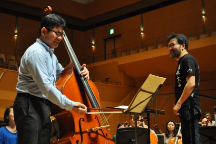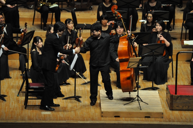 承前いよいよ今回の目玉。NINO ROTA。しんちゃん素晴らしかった。素晴らしいのは十分すぎるほどよくわかっていた。それでもこうやって間近で彼の演奏に接するとその度にいちいちびっくりして心動かされてしまう。最初はあまりのことに「これがコントラバス?!」とゆー感じになる。その驚愕度はヴァイオリンやピアノの名手から受けるそれ以上のものがある。そのうちすぐにそんなことは忘れて、ただひたすらしんちゃんの豊かな音楽と音色に魅了されてしまう。オケもお客さまもきっとそうだったでしょう。しんちゃん袖でかなり緊張しててびっくりしました。ステージに出てからの方が落ち着いて見えた。さすがーおれは彼のNINO ROTAは2回目。前回も今回もステージ上、彼のすぐ隣で体験できた。幸せなことだと思います。前回、若い頃のしんちゃんの演奏よりも、今回の演奏は音楽が一層豊かで深くなっていて、感激しました。おれは健常でも器用な指揮じゃないのに、その上半身麻痺で動きが悪く困ったポンコツ指揮者でしたがしんちゃんには助けてもらいました。後輩にこうやって助けてもらえるなんておれは最高に幸せ者だ。感謝です。オケにとってもこの曲は演奏も簡単ではないし、そもそも楽譜の手配のところがとても難しいのですが(へちまくんご苦労さまでした)、勇気を持ってチャレンジしてくれてうれしく思ってます。やっと実現してよかった。同じ中学の部活の自慢の後輩と並んで東京のステージに立てて誇らしい気持ちでいっぱいでした。練習の初期の段階は混沌とした状態で不安でしたが、オケが馴染んでくるとどんどんいい感じになってきて。本番はオケも非常によかった。Fロイデ、NINO ROTAいいじゃん(笑)。向いてるよ。また何かできたらいいね。オケのみなさんがちゃんとソロを聞いて良好なバランスを保ってくれたのが今回の勝因です。しんちゃんの音はよく鳴るけど、それでもコントラバスはコントラバス。楽器の特性や音域のこともあったりして、オケが常に気を使わないと、さすがのしんちゃんでもやっぱり苦しいのです。オケの皆さんはほんとによくがんばりました。管楽器もソロとの絡みやそれぞれいろいろ小さいソロがあったり面倒な箇所もけっこうあって大変だったですがみなさん素敵でしたよ。そもそもおれはNINO ROTAが好きだった。おれの場合はヴィスコンティやフェリーニの映画から入ったので、今回ほど自分が映画好きでよかったと思ったことはない。ホントに楽しかった。たまたましんちゃんが学校のコンチェルトでこれを選んだのがきっかけになってここまで来た。生きてるとおもしろいことがあるね。しんちゃんはおそらく日本でこの曲をオケバックで最も多く演奏したベーシストとゆーことになるんじゃないかな。ああ、終わっちゃたな。おれはこの曲がホントに好きだった。しんちゃんありがとう。最高に素敵でした。Beethoven。この曲は練習開始前から、賛否両論になるだろうと思ってやってました。どちらかとゆーと「否」の方が多く、良くても当惑したような反応になるのだろうと思っていた。おれ自身も当初はこれでいいのかと思ったくらいなのだから、当然そうでしょう。でも終わったら意外に暖かく盛大な拍手でブラボーの声も複数かかり、実はびっくりでした。アンケート では「賛」の声もあったようだ。おー、これまたびっくり。「否」ばかりだと思ってました。おれの大大大好きなクライバーの演奏のことは脳から完全に追い出すようにしてやりました。リズムがスポーティーに前に前に弾んでいくだけではなく、単に興奮に身を任せるだけではなく、ちょっとくらい遅くなっても重くなっても作曲家が執拗に書き込んだリズムのちょっとした差異や、ほとんど不自然かと思われるほど執念深く書き分けられた音楽のニュアンスのひとつひとつまで気を配って演奏しようと思った。最終的にうまく実現できなくても、オケのひとりひとりが楽譜のことを細かく考えて気を配って練習重ねて演奏すること、その意識の総体が音楽のオーラになるのだと信じていました。そうすることが、みんなで集まっているこの奇跡のように大事な時間を大切に大切に慈しんで、一緒に居るメンバーがお互いを大切にすることに繋がる。Beethovenの楽譜を拠り所にして、ゆっくりそーゆーオケになっていけばばいいなと思って練習を重ねてきました。当初、人が集まらず何となく元気がなかったオケも、みなさんが努力して最終的には人もぐんぐん増えてとてもいい雰囲気に変わった。そーゆーときに一緒に居られたのはうれしかった。感謝です。きのしたくん!遠く(上州)からありがとう!彼と東京で一緒にオケやってるなんて、本当に不思議だ。ちあきちゃんもいるし、うめもゆーこちゃんもいるし、名古屋関係の人がいつのまにか増えた。よく考えるとソリスト関連でもともしげくんもおれの名古屋関係の人脈なのだ。長野関連も、そう。くみこをはじめなっちゃんもた