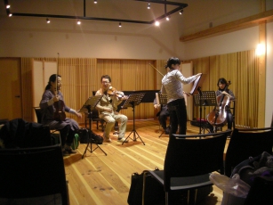 2014/04/06CO先生とともちゃんがホテルに迎えにきてくれて高浜市某所へ午前はリハーサル。いい響きの会場。気持ちのいい空間だ。昼食、みんなで連れ立って某ラーメン屋さん一見、ふつうの民家のようだ。塩ラーメン とても旨い大根餃子。おもしろいね。すっごい「大根!」だった。午後、本番。わーい楽しいね!カルテットありがとう!豪華カルテット!今回はバロックの協奏曲をカルテット伴奏で弾いてみよう!とゆー試み小規模ながらもちゃんとオケバックで協奏曲やってるような感じになる。ピアノ伴奏とはあらゆる点で全然違う。Kuchler ConcertinoTelemann1、2楽章Telemann3、4楽章Vivaldi Op.3-3全曲休憩Telemann全楽章Vivaldi Op.3-9全曲みんな無理なく楽器が自然に鳴ってとてもよかった。ソロがそうやってリラックスして弾くとカルテットも一緒にどんどん綺麗に鳴ってくる。やっぱり相乗効果だねえ。あたりまえだ。最後に発表会っぽく写真撮った。こーゆーのも良し。伴奏カルテット手伝ってくれたみなさんありがとうございましたもぐちゃん何から何までホントにありがとう!打ち上げはFかやくん作のインド料理。本格的だー。超旨かったあき先生作のケーキ。美味しい!いいママになるぞ!おれは結局あまり飲まなかった。日本酒を味見して、カルバドスとLimoncelloをちょっと味見した程度。ほぼノンアルコールに近い状態だったが、おれの分までまりちゃんが十分飲んでくれたせいか妙に達成感があった(笑)まりちゃん使用後お疲れちゃん!この日はにわけんもぐちゃんのおうちに泊めて頂きましたバリアフリーでお風呂もばっちり高齢者身障者仕様にできていておれは安心して過ごせました。もぐちゃんにいきなり宝塚の洗礼を受けました(笑)もぐちゃんの解説付きで映像を見ると楽しいね。「専科」とゆー言葉を覚えました。続く....