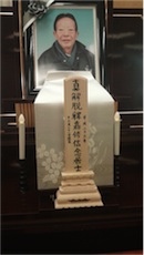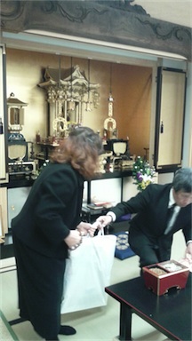 2014/12/23午前、がんばって実家へ。ひどい疲労を時々感じるがやること多すぎてよくわからない。10時、葬儀屋さん来て最終打ち合わせ老母、兄、家内と3人で大平庵で昼食兄とおれは中もり。かき揚げを分け合って食べた。老母はしっぽくそば、家内はにしんそば。おれと家内はヨーカドーでちょっと買い物して実家に戻る。午後、葬儀屋さんと納棺師さん来る。兄の嫁も到着。祭壇の設置(四十九までの祭壇)、老父のメイクなど。諸々準備準備万端整ったところで老父は葬儀屋さんの車で通夜の会場へ出発。西側の通常は閉め切っている古い門(こちらが正門)を開けて、ここから送り出す。亡くなった日も老父の遺体はこの門を開けて迎え入れた。今度老父がうちに戻ってくるときはお骨になっているんだな。感慨深く見送る15時過ぎに通夜の会場に到着18時から通夜。戒名も立派なのを付けて頂いた。老父の名前「嘉信」がうまく組み込まれている。「真解脱釋嘉修信念居士」通夜に来ていただいたみなさんありがとうございました。通夜の後の会食。大勢の親戚や住職と一気にしゃべったので、ものすごく疲れる。住職が帰るまでは完全にノンアルコールで過ごした。鮨やオードブル。日本酒は若緑だった。老父が好きな銘柄。住職送り出してから酒を解禁。溺れるように飲みたかったがやること多すぎて無理。わりと早めにお開き。