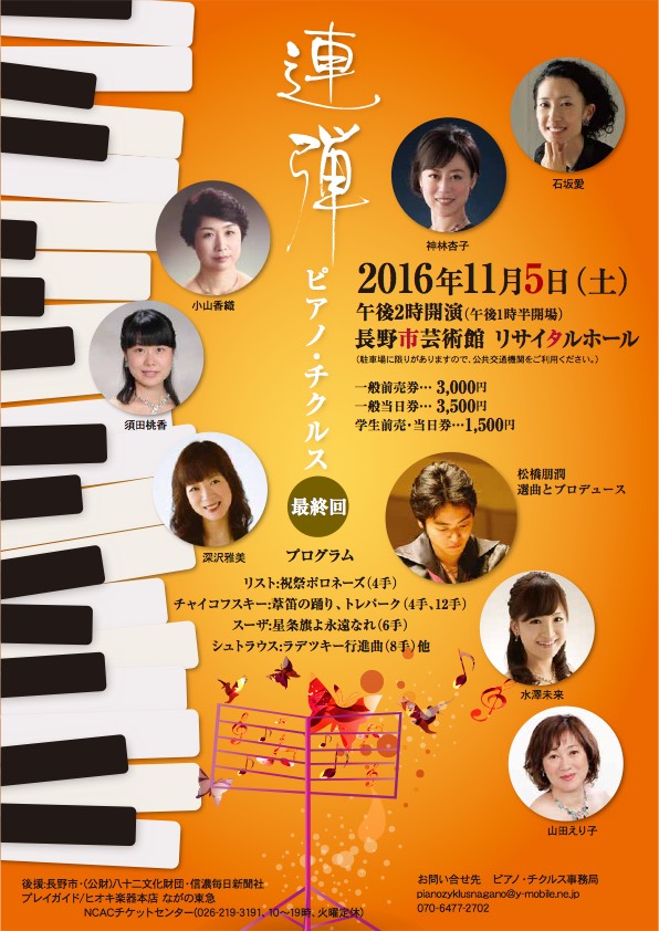 連弾チクルス最終回はいよいよ明日!11/05長野市芸術館リサイタルホール14時開演です。皆様ぜひぜひご来場ください!むちゃくちゃ楽しいコンサートですお問い合わせは電話07064772702メールpianozyklusnagano@y-mobile.ne.jp詳しいプログラムは以下の通りリスト:祝祭ポロネーズ(4手)primo:松橋朋潤/ secondo:深沢雅美ラフマニノフ:「6つの小品」op.11より(4手)第2番「スケルツォ」、第6番「賛歌」primo:神林杏子/ secondo:須田桃香ピアソラ:リベルタンゴ(4手)primo:石坂愛/ secondo:水澤未来チャイコフスキー:「くるみ割り人形」より(4手)トレパック 、葦笛の踊りprimo小山香織 secondo:山田えり子ラヴェル:「挿絵」(5手)primo:神林杏子 secondo:小山香織 terzo:松橋朋潤スーザ(編曲・松橋朋潤):行進曲「星条旗よ永遠なれ」(6手)primo:小山香織 secondo:神林杏子 terzo:松橋朋潤=休憩=マイク・コーニック:「3つの小品」(6手)1.Anyone for Tennis?/ 2.Baroque to the Blues / 3.Benodet Breezeprimo:水澤未来 secondo:山田えり子 terzo:深沢雅美ラフマニノフ:ロマンス(6手)primo:松橋朋潤 / secondo:須田桃香 terzo:石坂愛ラヴィニャック:ギャロップマーチ(8手)1神林杏子 2小山香織 3深沢雅美 4松橋朋潤ヨハン・シュトラウス1世:ラデツキー行進曲(8手)1水澤未来 2須田桃香 3石坂愛4山田えり子チャイコフスキー:トレパック(12手)1山田えり子 2神林杏子 3松橋朋潤 4深沢雅美 5石坂愛 6小山香織