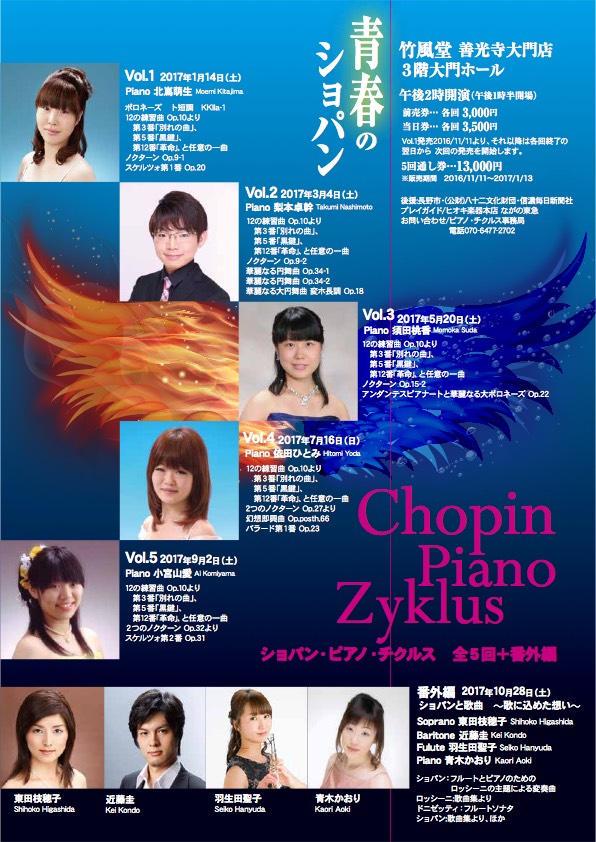 ショパン ピアノチクルス「青春のショパン」全5回+番外編(2回)レクチャー&プロデュース:加藤晃 会場:竹風堂善光寺大門店3階大門ホール2017年のピアノチクルスは「青春のショパン」です。ショパンが27歳までに作曲した作品を聴いて頂きます。青春時代のショパンはサロンやコンサートで大活躍する天才音楽家であり、祖国ポーランドの独立を願って一喜一憂する熱烈な愛国青年でした。28歳以後のショパンはジョルジュ・サンドと恋仲になります。それ以後のショパンはサンドとの生活に悩み、体調もすぐれず病気は悪化する一方でした。27歳までがショパンの「青春」だったと言っていいでしょう。27歳以下の長野の若手のピアニストたちの演奏で、青春時代のショパンの名作をたっぷりとお楽しみ下さい。お問い合わせ:ピアノチクルス長野pianozyklusnagano@y-mobile.ne.jp07064772702vol.12017年1月14日ピアノ:北嶌萌生ポロネーズ ト短調 KKIIa-112の練習曲Op.10から別れの曲・黒鍵・革命、ほか1曲ノクターンOp.9-1 スケルツォ第1番Op20vol.22017年3月4日ピアノ:梨本卓幹12の練習曲Op.10から別れの曲・黒鍵・革命、ほか1曲ノクターンOp.9-2 華麗なる円舞曲Op.34-1華麗なる円舞曲Op.34-2華麗なる大円舞曲 変ホ長調Op.18vol.32017年5月20日ピアノ:須田桃香12の練習曲Op.10から別れの曲・黒鍵・革命、ほか1曲ノクターンOp.15-2 アンダンテスピアナートと華麗なる大ポロネーズOp.22vol.42017年7月16日ピアノ:依田ひとみ12の練習曲Op.10から別れの曲・黒鍵・革命、ほか1曲2つのノクターンOp.27より幻想即興曲 Op.posth.66バラード第1番Op23Vol.52017年9月2日ピアノ:小宮山愛12の練習曲Op.10から12の練習曲Op.10から別れの曲・黒鍵・革命、ほか1曲2つのノクターンOp.32よりスケルツォ第2番Op31 番外編「ショパンと歌曲」2017年10月28日ソプラノ:東田枝穂子/バリトン:近藤圭フルート;羽生田聖子ピアノ:青木かおりショパンの歌曲よりロッシーニの歌曲より、ベッリーニの歌曲より、ショパン:フルートとピアノのためのロッシーニの主題による変奏曲ドニゼッティ:フルートソナタ ハ短調ほか番外編「ショパンの室内楽」2017年12月2日出演ogozze[ヴァイオリン:川崎妃奈子&ピアノ:松田紫帆]+チェロ:小島遼子チェロとピアノのための序奏と華麗なポロネーズ ハ長調Op.3ヴァイオリンとピアノのためのバラード第1番 ト短調 Op.23(イザイ編)ピアノ三重奏曲 ト短調 Op.8 ほか