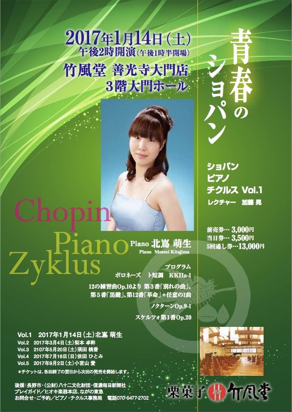 ショパン ピアノチクルス「青春のショパン」vol.1のお知らせいよいよ今週末です。vol.12017年1月14日 14時開演竹風堂善光寺大門店3階大門ホールピアノ:北嶌萌生(きたじまもえみ)ポロネーズ ト短調 KKIIa-112の練習曲Op.10から別れの曲・黒鍵・革命、Op.10-4ノクターンOp.9-1 スケルツォ第1番Op20レクチャー&プロデュース:加藤晃お問い合わせ:ピアノチクルス長野pianozyklusnagano@y-mobile.ne.jp070647727022017年のピアノチクルスは「青春のショパン」と題し、ショパンが27歳までに作曲した作品を、27歳以下の長野の若手のピアニストたちの演奏で聴いて頂きます。超フレッシュです。練習曲はOp10から毎回4曲。そのうち「別れの曲」「黒鍵」「革命」の3曲は「必ず」皆さんに弾いてもらいます。もう一曲は演奏者が自由に選ぶことになってます。萌生ちゃんのチョイスは4番コンクールみたいでちょっと意地悪な感じもありますが、聴き比べは楽しいですからね。楽しみです。今回のチクルスの最初に聴いていただくポロネーズ ト短調は、ショパンが7歳のときの作品です。今回はワルシャワ蜂起(1830)あたりまでのことを扱います。まだショパンはパリに行ってないので"Fryderyk Franciszek Chopin"の時代です。次回から"Frédéric François Chopin"になります。みなさま、ぜひご来場ください!