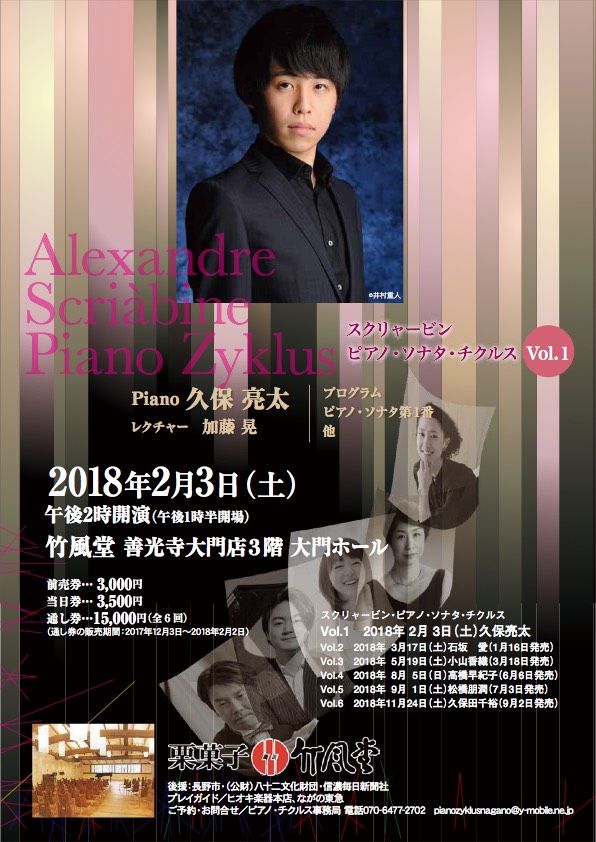 スクリャービン・ピアノ・ソナタ・チクルス vol.12018/02/03ピアノ:久保亮太レクチャー&プロデュース:加藤晃 会場:竹風堂大門ホール14時開演スクリャービン二つの夜想曲Op.5左手のための二つの小品Op.9ソナタ第1番ヘ短調Op.6 エクスタシーの時間は時間の一瞬であることをやめる。それは時間を吸収する和声と旋律の間に差異はない。それらはひとつで同じものだ (スクリャービン)スクリャービン・ピアノ・ソナタ・チクルス全6回の予定はこちら!いよいよ新しいチクルスのスタートです。ぜひご来場下さい!プログラム、これで確定です(2018/01/06)お問い合わせpianozyklusnagano@y-mobile.ne.jptel 070-6477-2702