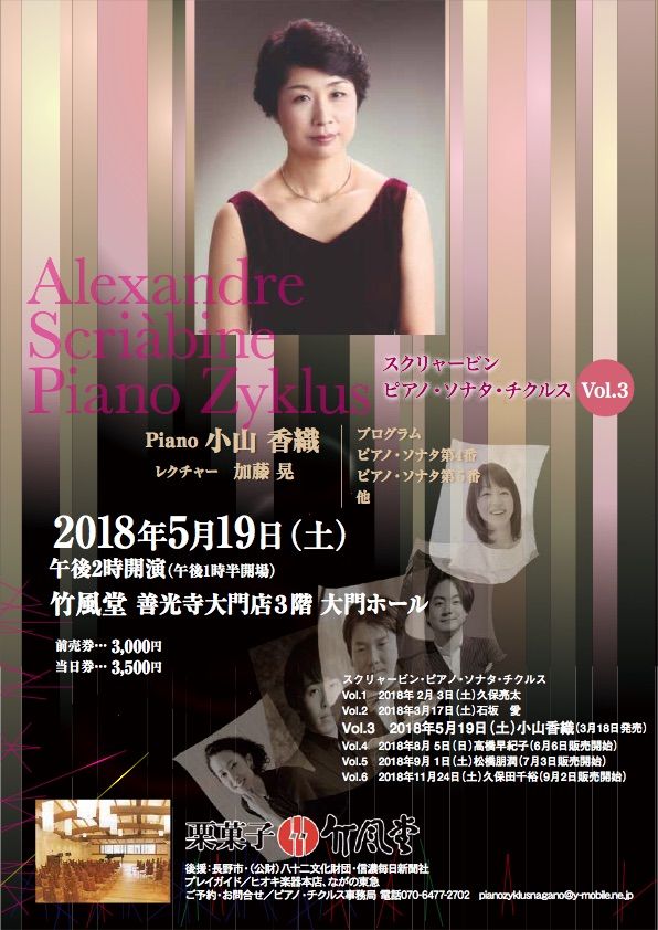 スクリャービン・ピアノ・ソナタ・チクルス vol.32018/05/19ピアノ:小山香織レクチャー&プロデュース:加藤晃 会場:竹風堂大門ホール14時開演前売3000円/当日3500円ぜひご来場ください!スクリャービン ソナタ第4番 Op.30ソナタ第5番 Op.53そんなわけで今週末19日はスクリャービンのソナタ4番と5番です。ピアノは小山香織さん。皆さま、ぜひご来場下さい❗https://t.co/7eITqfNeFn pic.twitter.com/WjzSMSqOgH— A.KATO (@_a_kato) 2018年5月14日エクスタシーの時間は時間の一瞬であることをやめる。それは時間を吸収する和声と旋律の間に差異はない。それらはひとつで同じものだ (スクリャービン)スクリャービン・ピアノ・ソナタ・チクルス全6回の予定はこちら!プレイガイド:ヒオキ楽器本店、ながの東急お問い合わせpianozyklusnagano@y-mobile.ne.jptel 070-6477-2702