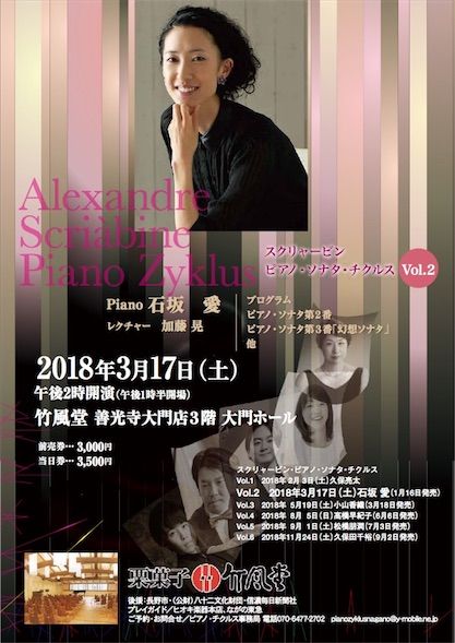 スクリャービン・ピアノ・ソナタ・チクルス vol.22018/03/17ピアノ:石坂愛レクチャー&プロデュース:加藤晃 会場:竹風堂大門ホール14時開演ぜひご来場ください!スクリャービン2つの詩曲Op.32(1903) ソナタ第3番 嬰へ短調 Op.23 (1897-98)ソナタ第2番 嬰ト短調 Op.19(1892-97)エクスタシーの時間は時間の一瞬であることをやめる。それは時間を吸収する和声と旋律の間に差異はない。それらはひとつで同じものだ (スクリャービン)スクリャービン・ピアノ・ソナタ・チクルス全6回の予定はこちら!お問い合わせpianozyklusnagano@y-mobile.ne.jptel 070-6477-2702
