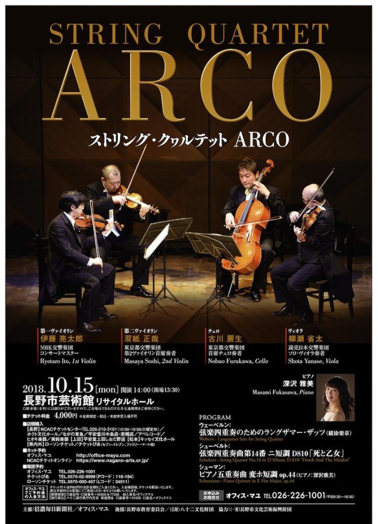 2018/10/15午後芸術館リサイタルホールへ。ストリング・クヮルテット ARCOのコンサート聴く。満席。平日午後の室内楽のコンサートでこれは素晴らしいこと。いや、マジで素晴らしいことだ。演奏は当然のことながら圧倒的に素晴らしかった。キリがないので詳しく感想は書かない。ひと言で言って、全体としてとても腑に落ちた感じ。ウェーベルンの緩徐楽章シューベルトの「死と乙女」シューマンのビアノ五重奏曲久しぶりに本格的な室内楽を聴いて大満足の午後になった。贅沢なひととき。素晴らしいカルテット。興味ある方はこちらを↓【送料無料】 Schubert シューベルト / シューベルト:弦楽四重奏曲第14番『死と乙女』、ヴェーベルン:弦楽四重奏のための緩徐楽章 ストリング・クヮルテットARCO 【SACD】(おれは個人的には双紙さんの圧倒的な素晴らしさにひたすらやられ続けていた)シューマンのビアノは深沢雅美ちゃん。すごかったー。カルテットとの一体感が素晴らしい。演奏内容がここまでくると「集客のために地元のピアニストで」とゆー段階は大きく越えてる(主催者はありがたかったと思うけどさ)。雅美ちゃんのビアノでシューマンの五重奏聴けてよかったとごく自然に思える演奏。個人的には最近の雅美ちゃんの演奏の中でもこれは出色のものだったように感じる。こーゆーピアニストが普通に長野に住んでいて、演奏して教えてるってことを心から誇りに思う。いい気分で帰宅。夕食つくね風ハンバーグもうちょっと小さいのをいっぱい作ればよかった。つくねは大きくしない方がきれいにまとまるのかもな。またチャレンジしよう。