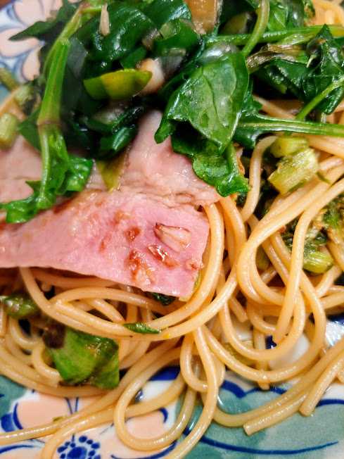 2022/04/02実家で庭仕事。昼メシ、パスタ。ふきのとう、ほうれん草、ネギなど庭で生えてる野菜で。家内作岩野裕一「王道楽土の交響楽」読。すごい本。めっちゃ刺激的。超興奮した。ホッケフライ夕飯天ぷらいろいろ魚肉ソーセージ天はおれのリクエスト