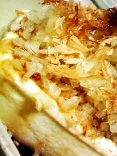 このように、タマネギのみじん切りと鰹節がどっさり乗るのが我が家流