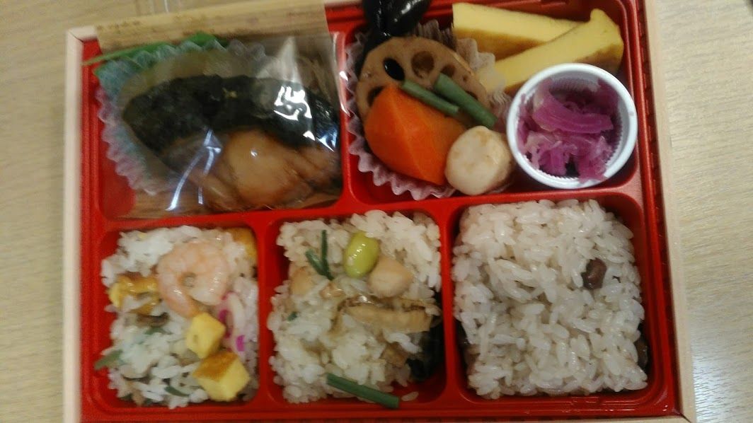 夕方楽屋でお弁当をいただきました。おこわ弁当。