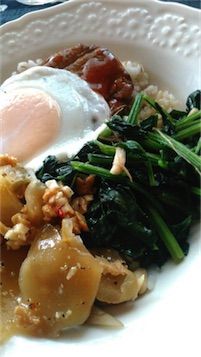 色々のせてぐっちゃぐちゃに混ぜ、えごま油をたらして食う。