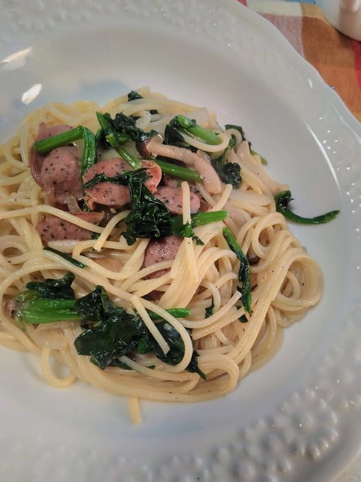昼食、ほうれん草のスパゲティ作って
