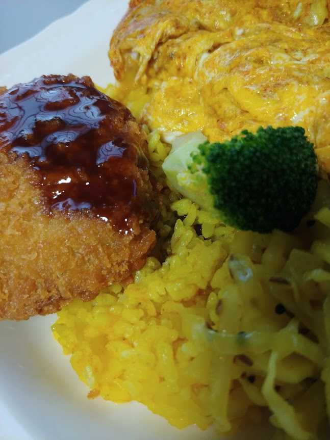 昼、ターメリックライスとアチャール、ローソンのおかずコロッケ、玉子のポリヤル。これはやっぱり、明らかにどう見てもカレーだ。
