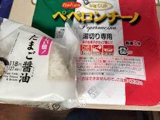 エースコックのペペロンチーノとセブンのたまごおにぎり。
