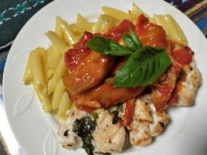 チキンのトマトソース、つけあわせマカロニ。