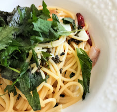 昼、紫蘇の実、大葉、自家製パンチェッタのパスタ