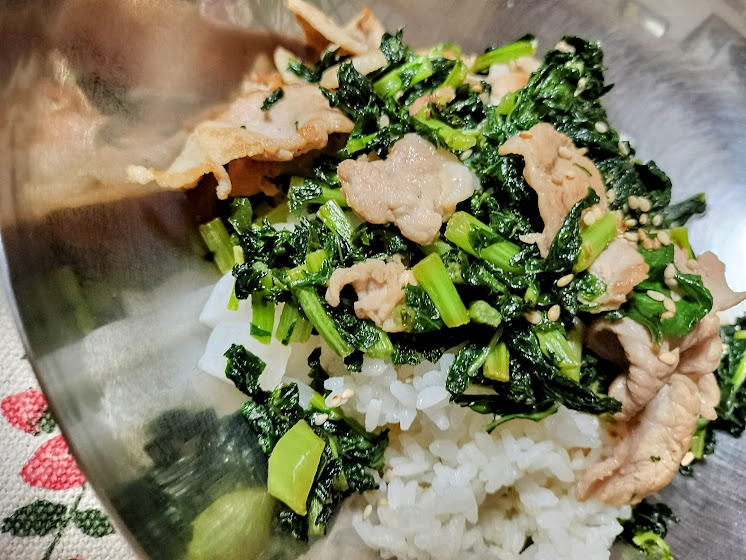 大根葉と豚肉炒めてご飯にのせて大根葉めし。うまっ