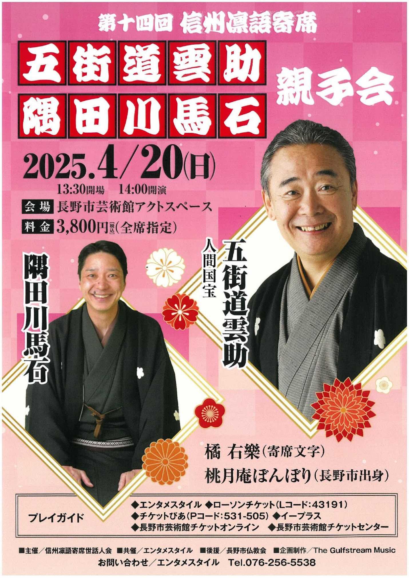 2025/04/20芸術館アートスペース 五街道雲助隅田川馬石親子会。いい感じにほぼ満席開口一番は桃月庵ぼんぼりさんの「つる」。とてもよかったぼんぼりさんは前に白酒師匠のときにも開口一番だったのでこれで2回め。ほとんど二つ目的な貫録。なかなか素晴らしい。こーゆー優秀な人が長野出身ってのがうれしいね。応援したい。馬石師匠は今回初めて。ずっと前からぜひ聞きたいと思ってたからうれしかった。めっちゃすごかったー。たらちねずっこけ火焔太鼓寄席文字実演。橘右楽さん。おもろい、興味深い。死神雲助師匠、昨年鈴本で聞いて以来。やっぱり最高。昼、パスタ作る夕メシルーロー飯作る