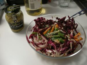 なんと昨日のアクセス数は、162になりました、ありがとうございます。とてもうれしいです!! 昨日の我が家の夕飯は、Lasagnaでした。この前、いっぺんに、三食分作り、冷凍しておいたのです。今日(月曜日)は、娘のバレエ教室があり、家に着くと、ほぼ八時近くになってしまうので、冷凍物を食べますが、私が作ったものです。Lasagnaプラス「サラダ」を、食べました。このサラダは、見本市のVipClubで、食べたものです。この時は、サヤインゲンだけでしたが、私の場合、他に、にんじんを入れます。そして、紫色のサラダ菜を加えます。このサラダ菜は、苦いです。 にんじんとサヤインゲンを、茹でて、マスタードを混ぜます。苦すぎた場合、マヨネーズもくわえます。このマスタードは、フランス製で、なかにぷつぷつのからしの豆粒が入っています。日本でも手に入るでしょうか??からし入りなので、ステーキなんかに、添えるのにも適しています。前回、忘れてしまったのが、このホワイトソース、ここのが一番いいです。前に、日本でLasagnaを作ったことがありますが、ホワイトソースが、硬くて、美味く出来ませんでした。手に入らない場合、自分で作った方が、美味く出来ます。 試してみてください!!
