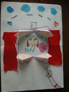 19日、木曜日。天気予報とは裏腹に、今日も暖かい。洋裁教室は、今週だけ、木曜日から金曜日に移動した。よって明日行きます。今朝は、寝室、娘の部屋、廊下の床掃除(フローリング)。浴室、台所の床掃除。をした後。 金物店(ねじを買った。)、薬局、パン屋、布屋に行きました。疲れた。 イタリアには、毎日聖人の日があり、カレンダーには、毎日違う聖人の名が書いてある。今日は、聖人ジュゼッッぺの日で、ジュゼッペとは、イエス・キリストの母マリアの旦那様、キリストの育ての親(キリストの本当の父親は神。)。よってイタリアでは、今日は父の日。娘が、昨日学校で作った父の日カード。 仕方なく、アーモンドタルトを作った。 食べてしまってから、写真を撮るのを思い出しました。食べかけですみません。美味しく出来ました。 父のデー・メニューは、パパの好物ばかりにしました。もう前に載せましたが、写真を載せました。 ズッキーニのスフォルマティーニ まず、ズッキーニを茹で、柔らかくします。水気を取り、ミキサーにかけ、液状にします。ズッキーニ600gに対して、卵3つ、クリーム100g、パルメザン35g、ナツメッグ、塩、胡椒を入れて、よく混ぜます。(6こ分)そしてこのように、湯煎にかけます。オーブン185度50分。 出来上がり。何かソースを付け足すと良いでしょう。トマト・ソースなんか、他にもにんじんなど、色々な野菜でも、出来ます。なんか料理のしすぎで、今日は疲れた。