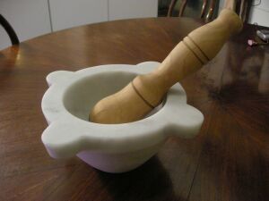 これが有名なmortaio! 大理石の部分をmortaio呼び、木の部分をpestelloと呼びます。前の日曜日、ペスト・ジェノヴェーゼの作り方を見せましたが、ミキサーを使わず、これでするのが伝統的な作り方。ただ時間と力がかかる。ここでミキサーを使う訳です。 前は、我家でも、これを使って作っていたが、時間がかかるので、ミキサーに切り替えた。 このペストの本場ジェノバのあるリグーリア地方では、朝から旦那さんがこれをかき回しながら、道端で話し込んでいるのを、見かけたことがある。