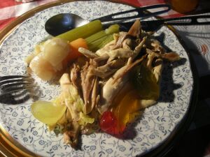 イタリアでは26日土曜日。聖ステファノの日も祝います。 毎年来る友達ファミリーも来ない静かな日でした。 今日は、Capponeの料理の日。Capponeとは、鶏より少し大きくて、脂分が多い。 今日も昨日と同じ前菜。そして、Capponeは、lessoと同じく、圧力鍋にて、セロリ、ニンジン、玉ねぎと共に煮込みます。イタリアでは、この3種類の野菜をodoriと呼んでいて、匂い取りに使います。 lessoに似ています。ここでは、モスタルダといって、フルーツが入っているマスタードで、甘くて辛い。フルーツがマスタード。 これが有名なモスタルダ!お肉と絶妙に合います。 lessoの時はこのモスタルダが見つからず、困りましたが、今回はなんとか見つけました。 午後はケーキ作りを始めました。 午後から、友人がやってきました。プレゼントに、 今シーズン新発売のerbolaioバスソープ。シャクヤクの花。ここの商品は、いつも水彩で描かれたイラストを使います。とても美しいです。クリスマスパッケージも毎年美しいです!! ケーキが焼きあがりました。 イタリアでは、クリスマスにはシナモンの入ったケーキを食べます。 よって、乾燥イチジク、くるみ、アーモンドパウダーが入っているケーキです。NHKのお菓子百科から、レシピを取りました。とても美味しくて、友人もおかわりをしたほどです。 27日日曜日。曇り。 なんと、クリスマスプレゼントに買ったニンテンドーDS(イタリアでも大人気!)のソフトが、たまたま欲しがっていたソフトが中古で売っていたので、買ってみたら、ゲーム自体が暗証番号付だったために、前の持ち主の暗証番号を消してなかったので、ゲーム開始が出来ず、リセットしてもらいに行こうとしたら、なんと車を預けている駐車場が閉まっていて、いけなかった。おかげで、スーパーに行って、足りない物を買って、終わった。 今夜は、毎年お馴染みに、残り物スモークドサーモンを切ったもの、ねぎを細く切ったものを、レモン汁に浸します。胡椒をたくさんかけて、湯であがったパスタを入れて、混ぜれば、美味しいパスタの出来上がり! 試してみてください! 今夜で、ツリーに飾る緑のくす玉が完成!青系は2こ作ったので、緑はこれが初めて!
