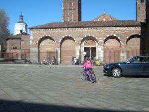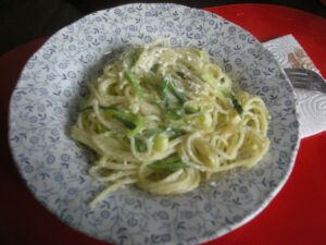 5日月曜日。晴れ。 今日はPasquettaといって、イースターの次の日は、ピクニックをする伝統があります。又、天使の日とも呼ばれています。 主人は、足が痛いとか?私としては、天気がいいので、外に出たい!と、娘と共に自転車で、ミラノお城、スフォルツェスコ城の後ろ側の公園に行ってきました。 まず、我家から出て、お馴染みのSant'Ambrogioサンタンブロージョ教会。ロマネスク調です。いつも車の駐車でごったがえるのですが、今日は車一つ見当たらない。結構、観光客が多かった。次に、カドルナ駅に到着、ミラノのシンボル、ファッションの町を象徴して、針と糸。私は好きではないんですけど.......、国際線マルペンサ空港から、ここに電車で着きます。カドルナの駅から、スフォルツェスコ城、右横に着きます。 正面からではなくて、横側からお城に入りました。ミラノはがらがらだったので、人はいないだろううと思いきや!いるいる! お城の中庭、このお城にはかのレオナルド・ダ・ヴィンチが、相談役として、滞在していました。滞在中に最後の晩餐の絵を書いたり、フランス王などの為にからくり物、箱など、多数の物を作りました。この後残念にも、フランスに行ってしまいますが。お城から、後ろの庭に出ると、公園になっています。たくさんの春が見つかりました。池があったり、橋があったりと、結構自然に親しめます。 意外と以外で、たくさんの人々でいっぱいでした。ニュースでは、不景気に関わらず、皆出発した。と、いっていましたが、いるではないかー!! 結構、公園の喫茶店外にて、日光浴しようなんて思っていたら、満員で、座るどころではなかった。この後、カキ氷を娘は食べて、一休み。公園を自転車でうろうろ回って、お城から出ることに。 公園から、お城の中に、宮廷、この先が、中庭。そして正面口から出たところ。 この後、正面口のまっすぐのDante通りを通って、家に帰りました。このDante通りには、たくさんのカバンなどの偽物が、下に置かれて売られてました。夕飯。今夜は春気分メニューにしました。 アスパラガスにさっと湯を通してから、玉ねぎのスライス切りとアスパラガスをEVオリーブ油で炒めます。その後、ゆでたスパゲッティーをフライパンに入れて、具とよく混ぜて、黄身と卵を溶いたものをフライパンに入れて混ぜます。(火は消したまま)そこに、胡椒をかけて、パルメザンを混ぜて出来上がりです。アスパラガスをたくさん使う贅沢物。カルボナーラの作り方と似ています。 この野菜trevisanを大きめに、千切りにします。玉ねぎのスライス切りと共に、ベーコンを炒めて、マッシュルームを入れて、気持ち白ワインを入れて蒸します。余熱のところにtrevisanの千切りを入れます。 コレは私のレシピ!ずっと前から考えていたものです。上手く出来てうれしい!