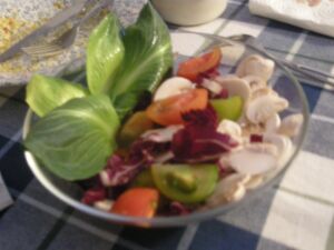 さて、日曜の夜にロール巻きと一緒に食べたのは、サラダ。 イタリアに来てから習ったのですが、生のマッシュルームは、美味しい!! 新鮮なうちは真っ白で、白ゴマをかけてもおいしいです。この葉っぱは苦いです。 12日月曜日、晴れ。寒い。13度。寒いので、スカートにブーツを履くほどなんです。 今日から学校が本格的に再開始! 朝から、家の整理整頓、掃除で、あっという間に16時半。 復活祭休暇で、ヴァカンスに行っていた友人は、お土産をくれた。 羊ちゃんチョコ、クッキー、EVオリーブ油=リグリア地方のオリーブ油も有名です。 ジェノバのあるリグリア地方に、Alassioと言う町があって、そこに私の友達は毎回行きます。そこの名物品、しかも結構高いお菓子。 このクッキーは、baci d'Alassio=アラッシオの接吻。と言われているもので、よく見ると横から見てキスしているようなのが分かりますか?? ココナッツ粉から出来てているクッキーにチョコレート。なんとも高カロリーなんですが、美味しい!!パルミジャン、日本ではパルメザン。金庫に入れたくなるほど、高いのですが、美味しい。なんと、これももう一人の日本人の友ママからのお土産!! この大きさは、我家の一ヶ月分うれしい!他にも石けんをもらいましたが、チーズをもらった時は、友人からも「本当にうれしい顔をしていた。」と言われるほど、嬉しかった!バカンスに行かなかったが、お土産をたくさんもらえました。 娘を学校に迎えに行き、家に連れて帰ってくるが、一向に宿題をしない。午後から夕飯の支度。 この時期、イタリアでも大根は手に入ります。 大根、ニンジン、ネギ、ショウガをサラダ油で、炒めます。 その後、スペアリブを焼いて、なべに入れるだけ、でも2時間を煮る必要があります。 出来上がり、今夜はスペアリブの大根煮でした。 発見、日本の友人が持ってきてくれた浅漬け、柚子!美味しかった。 出来上がり、柴漬けといい勝負かも?我実家近所に売っていないんだなー