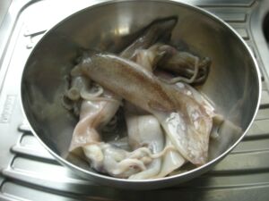 15日の昼食は、 昨夜のイカ、少し多めに買っておきます。と言っても一個分。 16日金曜日。 娘を朝学校に送っていくと、覚悟して直ぐに郵便局に行く事にした。 あまり待つこともなく、滞在許可書の手続きは済んだ。家に帰ると、9時40分と、早かった。 おかげで、ウェークエンド前の掃除を余裕で済ませ、ちょっとくつろいでいると、なんと手続きの書類2枚も入れていないことに気がついた。 急いで郵便局に電話をすると、「直ぐに行けば、封筒に入れてくれる」と言うので、走っていくと、手続きをしたお姉さんは「だめ!」と言う。もうハンコウをしてしまったからだめと言う、私は「電話の人は出来るといったのに、」と、言ってもだめだめ!「書類は警察に引き取りに行く時に、もって行けば平気!」なんて言っていたが.......怪しい!! 昼食は、日本から小包も着いたので、そば。 わかめ、ほうれん草、かにカマボコ=フランス製なのからか、高い。が入っています。 汁が少ないのは、イタリアでは貴重なおしょうゆ節約の為。夕飯は、riso bisiとパイもの。 最近凝っているのが、この紫色raddocchio lungo,ほうれん草、玉ねぎ、待つのみ、アーモンドスライス切り、を軽く炒めた物を、中身に入れて、スライスチーズを上からのせて、出来ているパイ生地に入れて、卵を塗って、オーブンに入れ出来上がり。 最近は、パイ生地一つの箱から2回分作れるように、半分に切って、半分の半分を折って作るやり方をするので、この形になってしまいます。この具でもなかなか美味しかったです。 夜は、前に作ったネックレスとお揃いになるイヤリングを作った。