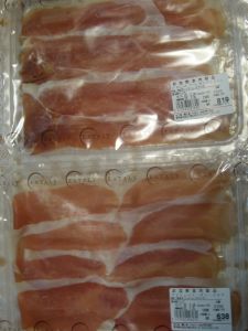 18日日曜日。 日本橋三越の地下食品街。 Eatalyコーナーがあり、イタリアの自慢の食品が売られていました。Eatlyなんて、好いネーミングです。 とても日本語の上手なイタリアの人のお兄さんがいました。 はて、イタリアにて、もっとも重要な食品製品ハム類がメインです。 イタリアでも、高いハム。日本だとやっぱり2倍くらいの値段になっていました。高い!今回、Parma(パルマ)、San Daniele(サン・ダニエレ)両方のライバルを買いました。Parmaは、少し乾燥めで、しょっぱい。San Daniieleは、ちょっと甘め。でもしょっぱい。この両方では、好きな派が出来るんですが、私の場合。どっちも好きなので、スーパーで切り売りの場合、脂肪の少ないほうにしています。 でも、メロンには、パルマの方が合うかもしれません。 これは、サラミです。おまけでした。こっちのほうが欲しくて、2つ買ったところがあります。サラミは、ミラノと呼ばれています。サラミは、ミラノの他に、ハンガリーのが、人気ですが、イタリアで作られるハンガリーのサラミは、ハンガリーのPickのものと比べられれないほど美味しいです。 ちなみに、パンも売っていました。娘にして、すごい御馳走の日でした。