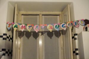 15日金曜日。 今日がお誕生会の日です。 娘を学校に連れてゆき、家では、すぐに掃除を開始。昨日までに一応整理はついたので、残りは、掃除。 お昼の後、 飾り付けをすませる。ここは、キッチンで、Tanti Aguri=おめでとう!これで3年目。 娘の部屋の入り口にも、飾りをつけました。ケーキ作り。昨夜にケーキのスポジを焼いておいたので、飾りをつけるだけ、ケーキ作りに欠かせない電動のかき混ぜる機械?名前が出てきません。 しかし、ケーキを2つ作るところから、材料を間違えると言うハプニングが起き、かなり固まってしまった。 チョコレートクリームの物。 うまくごまかせたケーキ。娘はこっちのほうが気に入ったらしい!次に、focacceとpizzetteをとりに行く。コレが有名なフォカーチェとピッツェッテ、Zerbinoのが、市場の美味しい! 誕生会のテーブルの上。 なんとか、準備完了! クラス全部の女の子を呼びます。選ぶと、呼ばれた、呼ばれないので揉める為です。全員で、娘を合わせて10人。一人来れませんでしたが、一人は従姉妹を連れてきたので、ッ結局10人でした。 今回、仲良しママに、娘を彼女の娘と共に学校からピックアップしてくれるように頼んでおいたので、家で、皆が来るのを待てばいい形になったので、楽でした。 16時45分くらいから始まりました。イタリアの場合、誕生会では、マジシャンなり、呼ばなくてならないのですが、高い!!そこで、私がコレで、2年目折り紙を皆にさせます。イタリアでは、折り紙の文化がないので、やりたくても出来ないが現実で、で切る人がいると、重宝がられます。 今回は指輪にしました。 かなり簡単に出来ます。いつも折り紙の凄さを感じさせられます。 イタリアの女の子たちは、わめく、落ち着きがないで、ほとんど精神病院入りの状態でした。ケーキの時間です。だいたい18時から半くらいの間に行ないます。 ケーキを食べて、遊びながら、保護者が迎えが来るのを待ちます。イタリアでは、プレゼント+誕生会に来てくれたお礼に、お返しをします。日本のダイソーで、色々なシールを買いました。今年の夏ブログに載せました。日本で毎回100円ショップで買ってきます。そして、かなり色々と頂きました。 今度、誕生会に呼ばれたときが恐ろしい! イタリアでは、小学校でクラス変えがありません。よって、5年間同じクラスメートです。付き合いが長い成果、娘の好みが良く分かった感じ。夕飯は、ケーキを18時45分頃に食べたので、軽くしました。ブロッコレット、日本は高いですよね!!ブロッコレットの美味しい食べ方。茹でた後に、ニンニクと、アンチョビとペペロンチーノで炒めます。茹で上がったリングイネを入れて、出来上がり。サラダに、今日から食べれる、旦那の作ったナスのオリーブ油漬け、にんにくも入っているので、夜しか食べれない。しかも辛い!夜は、死んでいました。