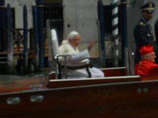 8日日曜日。ちょっと遅くなりましたが、 娘の通う学校のクラスメートの友ママは、ミラネーゼですが、ラッキーにもヴェネツィア出身の旦那さまと結婚しました。 彼の実家は、かのリアルト橋の近所サン・ポール教会付近です。私の場合、ヴェネツィアを訪れて、イタリア留学を決めたので、心に深く来るものがあります。とても深い関わりがあるところです。ミラノから、電車で3時間です。電車で本土から、ヴェネツィアに入るところが、見逃せません。是非、体験してみてください。よって、ちょくちょくヴェネツィアに行くわけですが、この日は、なんと法王様がヴェネツィアへ!!というわけで、ヴェネツィアへ、行って来たそうで、ヴェネツィア本土で、集会ミサがありました。ヴェネツィアは、地理的にオーストリア、スロベニア、ハンガリーからたくさんの信者がやって来ました。ミサの後、カナレ・グランデにやって来ました。私は、テレビで見ていましたが、彼女がヴェネツィアにいっていうと聞き、写真を送ってもらいました。さすが、海の都のおまわりさん!!こんな姿になります。ブラーノ島、刺繍の島です。カラフルな家が有名です。ムラーノ島は、ヴェネツィアン・グラスの工場で有名。 ちなみに、ヴェネツィアの事が知りたい人は、塩野七生さんの「海の都の物語」をお勧めします。 ちなみに、あと100年持つか?と言われているヴェネツィアです。早めにご訪問して下さい!いつ行っても美しい都です。タイムスリップしたような?所です。