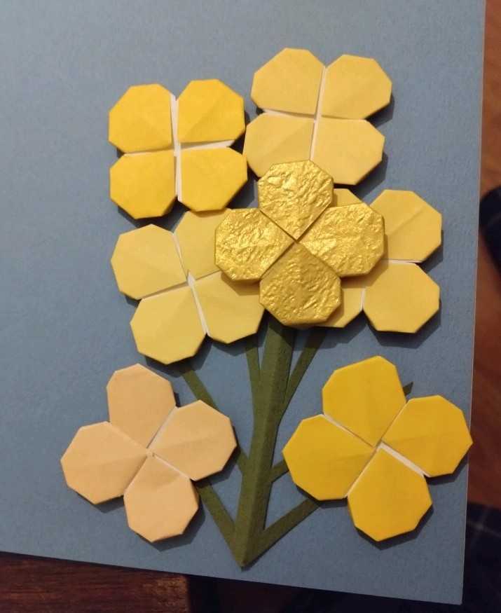 次の日、友達と日本食レストランでランチをする予定だったので、その友達に誕生日プレゼントを前倒しに渡すため、バースデーカードの準備。毎年、折り紙のバースデーカードを期待されるわけで、もう何年も送り続けているわけです。しかし、もはやネタ切れ、3月のモチーフって、結構少ないんです。💦菜の花はおり終わり画用紙の色合わせ。切って、てんとう虫のシールを貼りました。出来上がり!我ながら満足。来年は何を折ろうかな?