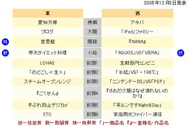 こんにちは、まりもですなんと・・本日2007年7月27日でe-お見合いスタッフ日記は2 周 年 ありがとうございますこれからもスタッフ一同、様々な内容でお送りしてまいりますのでどうぞ宜しくお願いしますさて2年前・・・みなさん覚えていますか2年というとそんなに時間が経っている訳でもないのですがあんまり覚えてなかったりしますよね~。時間が経つのは早いです・・・うう2005年がどのような年だったのか・・・思い出すために調べてみましたヒット商品番付を年末に近付くとよく見かけるコレです。ヒット商品番付とは・・・説明しよう←2周年でまさかのパクり出荷台数・売上高等の実績だけでな市場に与えた意義やインパクト・成長性などを総合的に判断して決定されています。また「東」「西」と別れていますがあくまで相撲番付形式であるから・・・・なので地域的なものは一切関係ないそうです。また対象となる商品は、個別の商品だけでなく一定のカテゴリーの商品群や人物・社会現象なども含まれるそうです2005年には愛知万博がありました!公式キャラクターモリゾー&キッコロ覚えていますか ・・・これはリアル・・・モリゾーキッコロ通信なるブログもありましたぞ(笑)要チェックですアキバは「秋葉原」ですね。電車男の大ヒットやメイド喫茶の繁盛があり様々な話題が提供されましたねまたこの年からブログが広まっているようです。実際、2005年頃から始めた方も多いのではあと iPod 今ではどんどんサイズが小さくなったりで種類もかなり増えましたね「ニンテンドーDS」VS「PSP」なんかもありました。今でもニンテンドーDSは人気商品ですよね。NANAも確かに話題になっていました。私、何気に買い続けていますよ・・・・タクミが好きですどうでも良いですねぎゃふんどんな年だったか思い出せましたか結構忘れていることって多いんですね2007年の番付は何になるでしょうビリーズブートキャンプは入りそうですよね・・・ビクトリーーッ今年も早くも後半戦に突入しております悔いのない1年になるように頑張りましょう~素敵なお相手は★e-お見合い★で見つけましょう★★★ 是非クリックしてくださいね ★★★